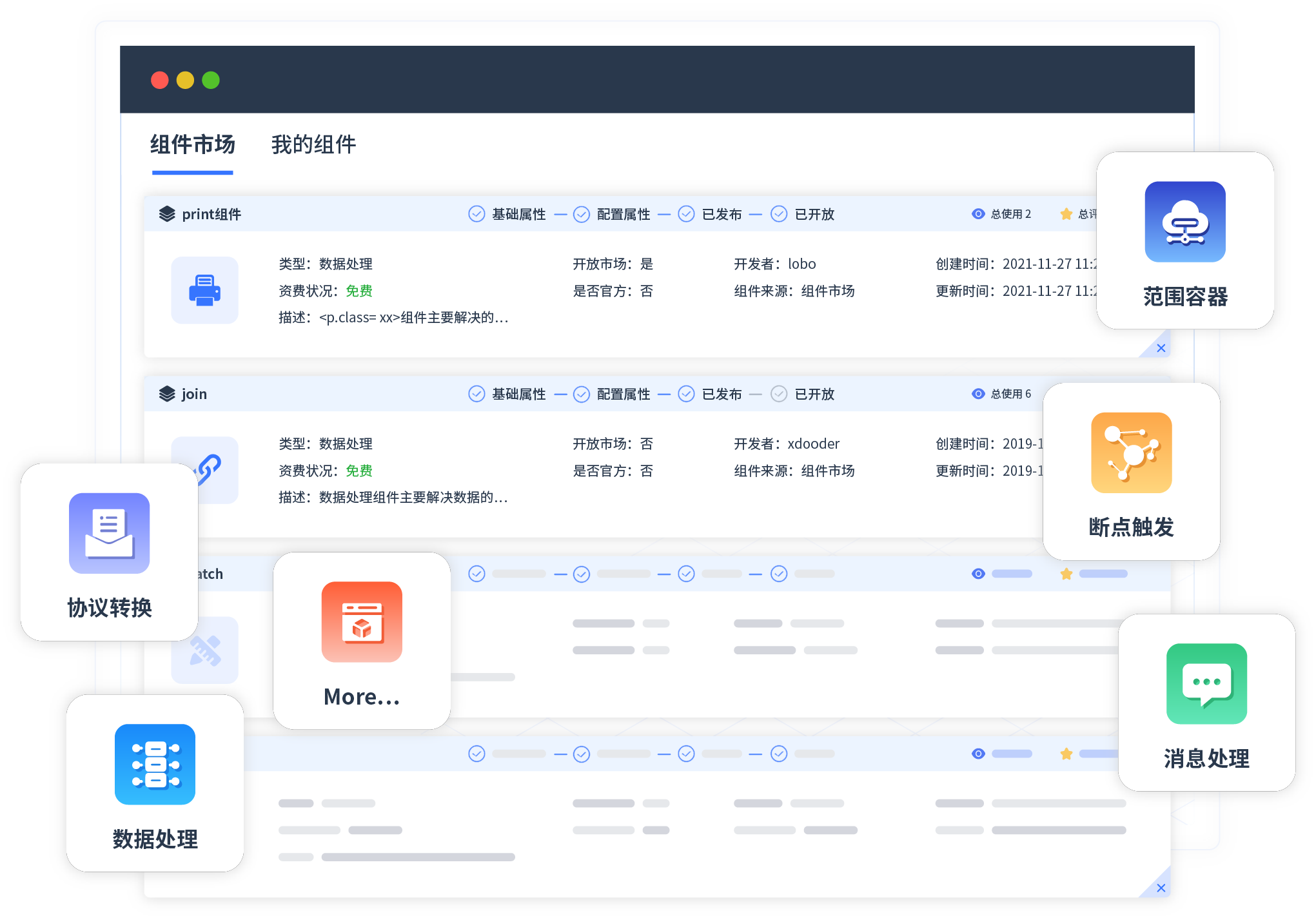 针对集成场景,万向娱乐提供组件市场,例如协议转换、消息处理、文件操作等。除平台提供的组件外,客户可以自定义所需组件。